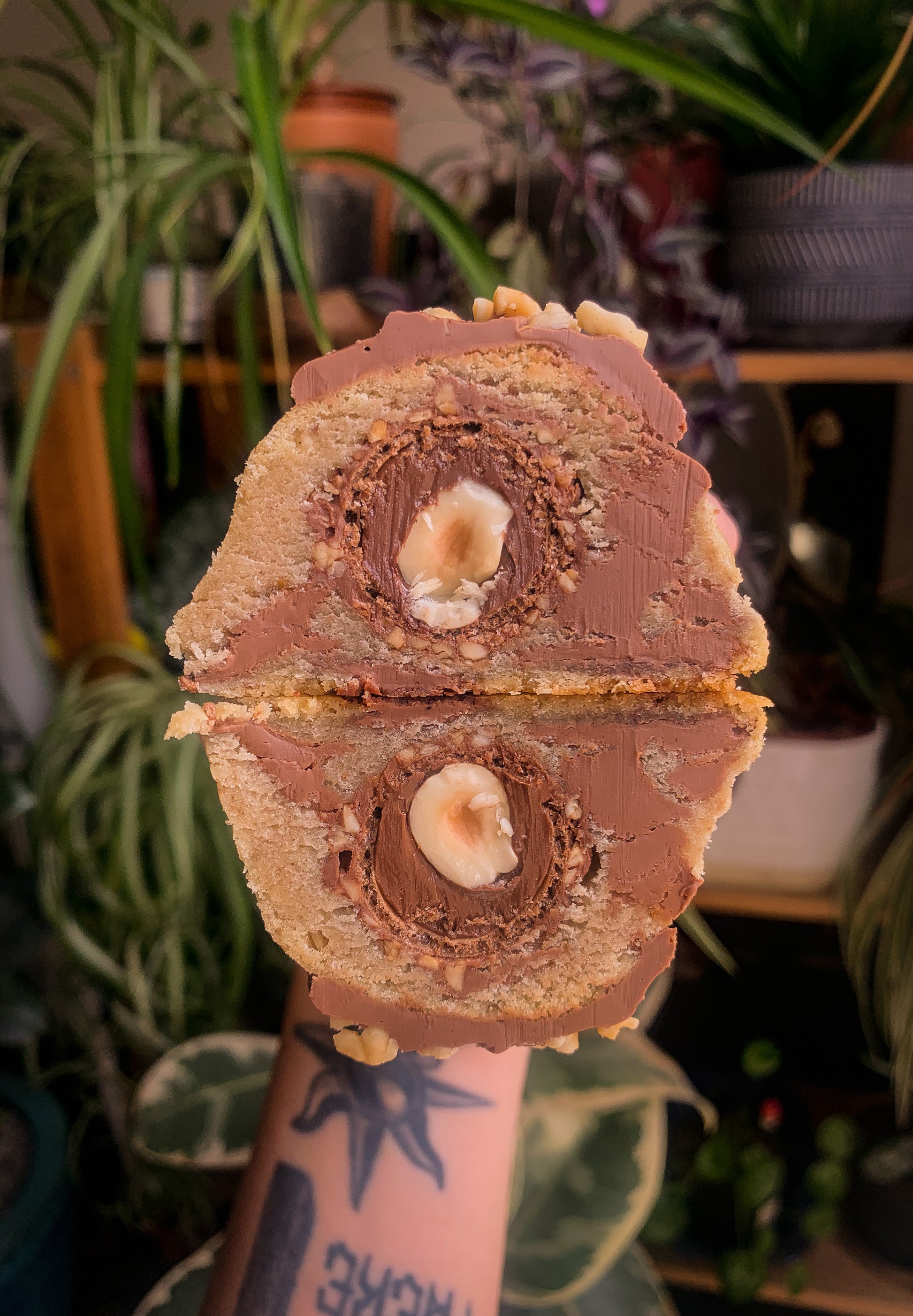 Classic choc chip cookie stuffed with a Ferrero Rocher and topped with milk choc and chopped hazelnuts. That’s an old pic, it’ll be better than that